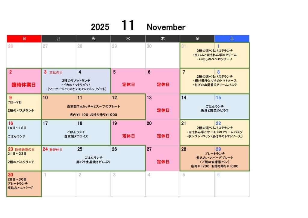 また、11月2日(日)は臨時休業いたします。ご了承ください。