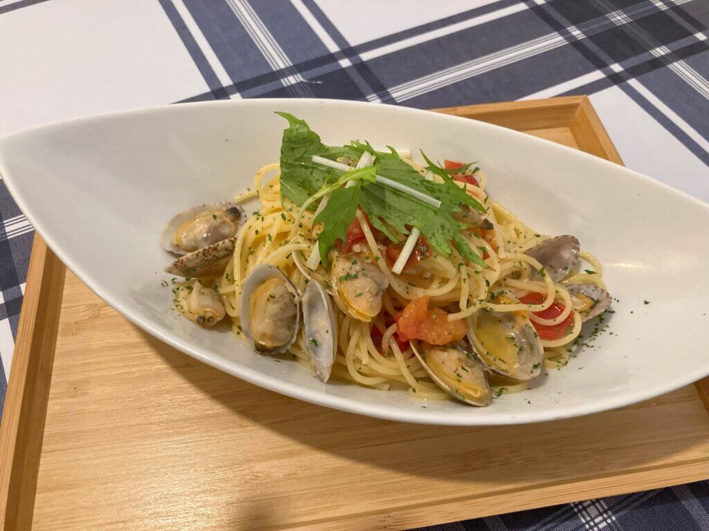 トマトソースを使用したオイルパスタです。ちょうどよい量のソースを麺にしっかりと絡めた食べるパスタ。