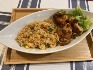 ランチのお持ち帰りは ジャンバラヤ&タンドリーチキンのセットで¥900 になります。