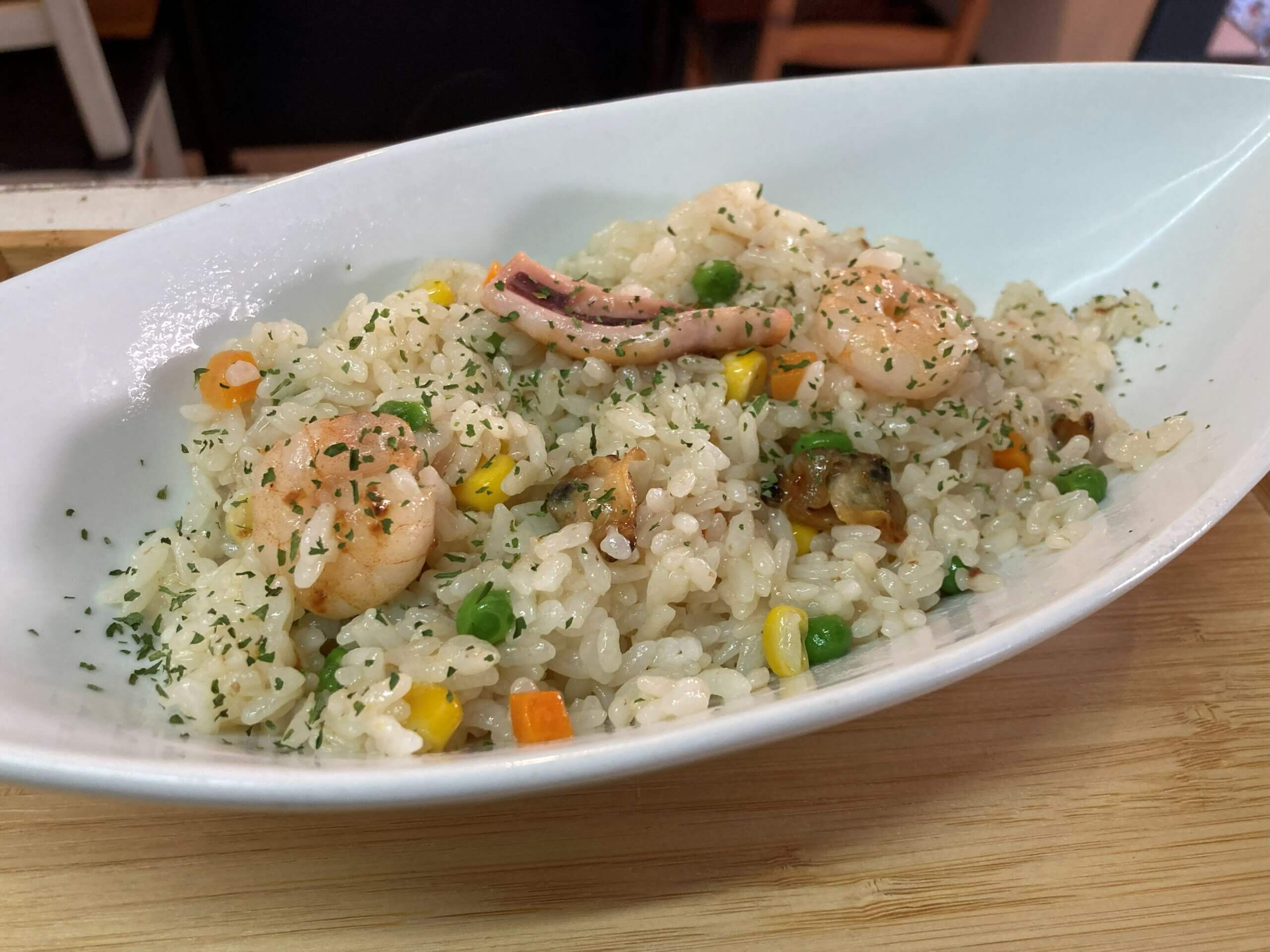 ミックスベジタブルと、えびやあさりなどのたっぷりの魚貝を入れた少し贅沢なピラフです!コンソメと魚貝のだしがきいたごはんを心行くまでお楽しみいただけます。
