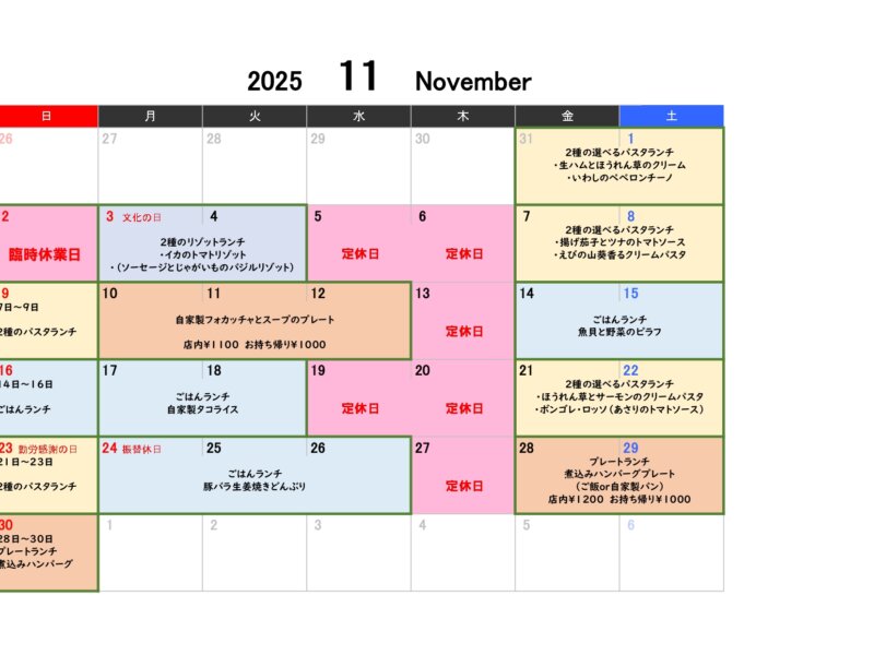 本日11月2日(日)は、臨時休業いたします。 翌日11月3日(月)は通常営業です。次回のサラダ付きランチは2種の選べるリゾットランチ『イカのトマトリゾット』or『ソーセージとじゃがいものバジルリゾット …